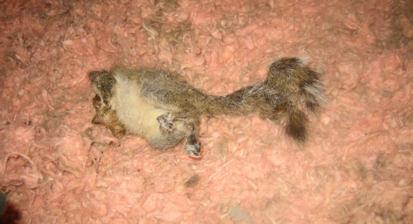 Every animal's life ends in death, and squirrels are no exception to the rule. Often a squirrel that has taken up residence in your house will meet with an unhappy ending while living in your home. You may be a direct part of their demise if you set out traps, or lay out poison. You may also accidently (or purposely) block its entryway. If it is severe weather, and the attic is neither heated in any way, or has no adequate ventilation, the squirrels are likely to die from exposure due to the extreme weather. Other times a squirrel may chew through an electrical line and are zapped. A squirrel's death could just be an act of fate. Such is the case of young squirrels that tend to die in large numbers because of their curious nature. They often seem to find themselves in nooks and crevasses that they cannot climb out of, fall into holes they cannot escape or become ensnared by a predator that surprised them.